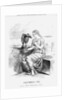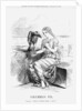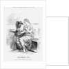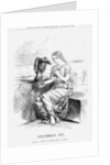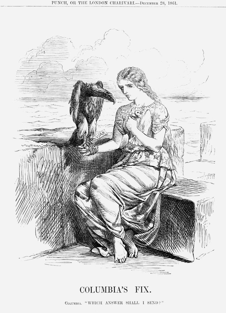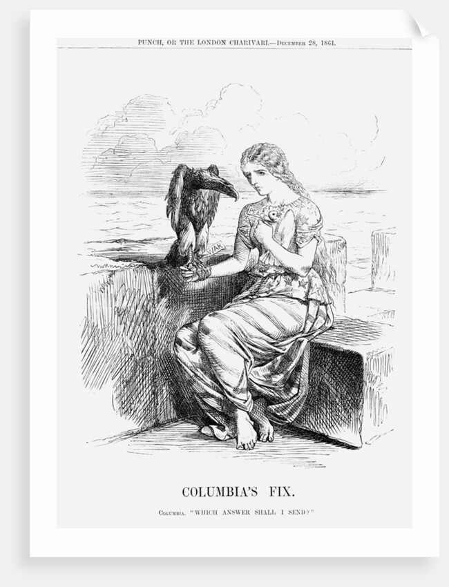 'Columbia's Fix', 1861. Columbia, representing the United States, sits overlooking the ocean. To her breast she holds the dove of peace, with the olive twig in its beak. On her wrist is the menacing eagle of war representing the American Civil War. The 'fix' she is in is having to decide between them. From Punch, or the London Charivari, December 28, 1861.