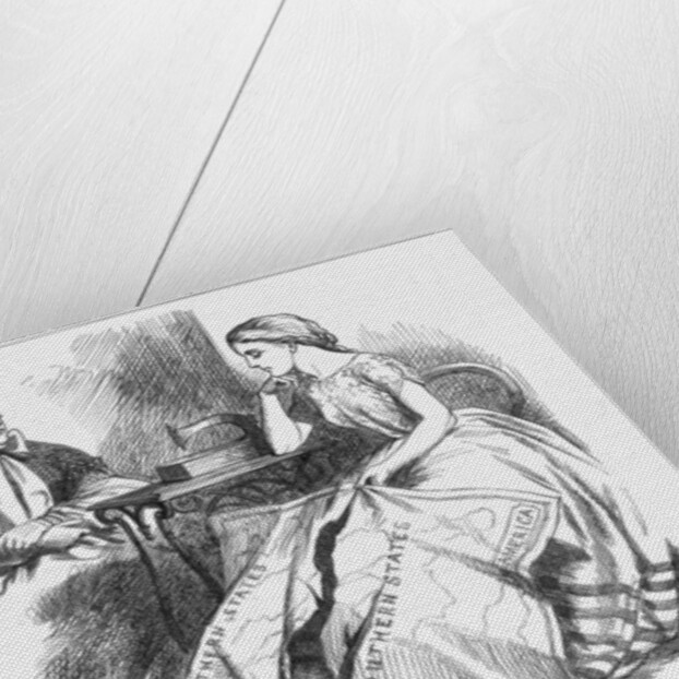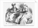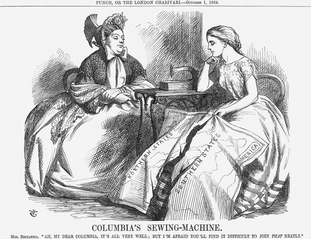 'Columbia's Sewing-Machine', 1864. Britannia says: Ah, my dear Columbia, it's all very well; But you'll find it difficult to join that neatly. The American Civil War was nowhere near a conclusion and the two sides were as bitterly opposed as ever. Here, a matronly Mrs Britannia looks at a girlish Columbia who sits holding a map representing the torn and divided States of America. From Punch, or the London Charivari, October 1, 1864.