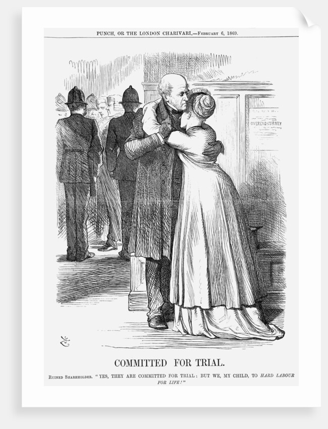 'Committed for Trial', 1869. A ruined man consoles his daughter. This refers to the trial of the former members of the firm of Overend, Gurney & Co, who were charged with an unlawful and deceitful conspiracy to sell shares in their company. Subsequent wild speculation had caused the company to fail and many members of the public lost money. On the 27th January, all the defendants were committed for trial. From Punch, or the London Charivari, February 6, 1869.