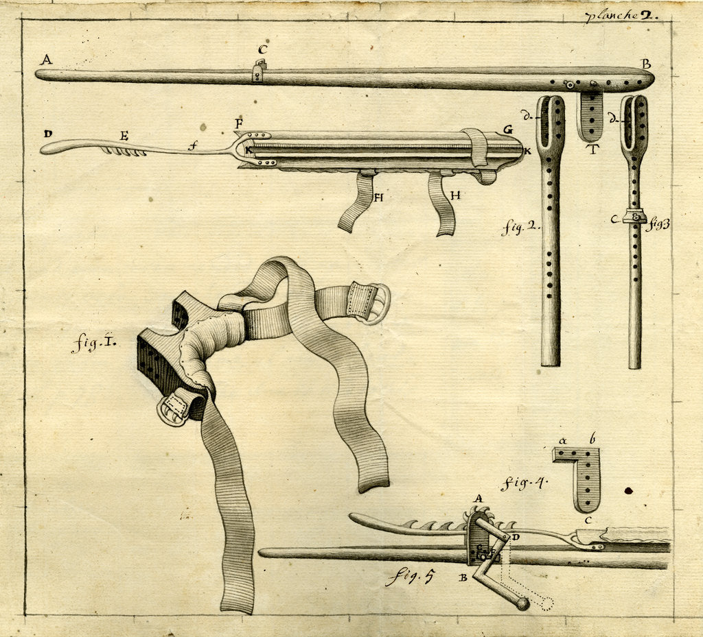 Illustration of components of the 'Ambe of Hippocrates', described as a most 'ancient and famous' contraption. It was designed for correcting luxated (dislocated) shoulders/ arms. Components for a 'new Ambe' modified and improved by Le Cat and presented to the Royal Society. Fig 1 -'The Bodice'- quilted so as to cause as little discomfort as possible. Used for attaching the patient to the chair. One strap goes around the body and the chair, the other around the shoulder of the patient; keeping the scapula and clavicle in place. This method was though most effective and reduced recurring luxations (dislocations). Image 2 from Ambi Nouveau (for reducing luxations of the arm with the shoulders rectified) by Claude Le Cat FRS, 17th Feb 1742/3. Ph. Tr. 42 387