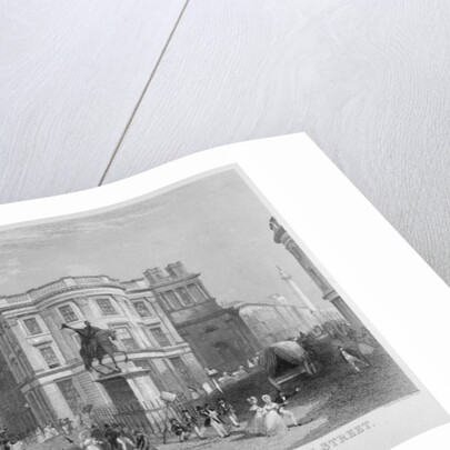 Cornhill, Lombard Street and King William Street, looking east, City of London, 1837. Just visible on the left is the Bank of England and on the right is the Royal Exchange with the statue of the Duke of Wellington in front. Also showing figures, carriages and carts in the street.
