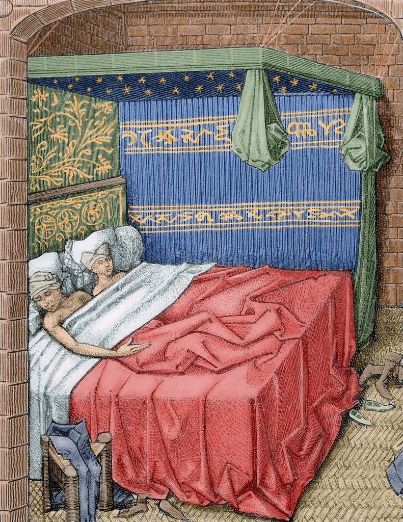 Couple in bed. 15th century. Engraving of "Miracles of Notre Dame"