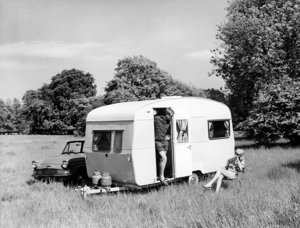 Product details Couple on holiday with their 1963 Sprite Alpine caravan