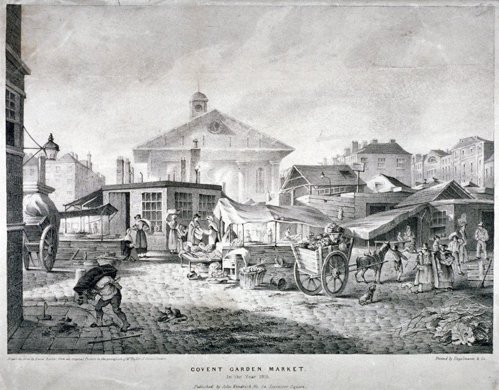 Covent Garden Market, Westminster, London, 1815. View of Covent Garden market showing traders and customers. The market stall in the centre of the image appears to be selling cabbages.