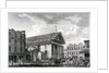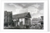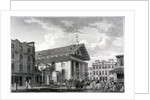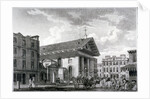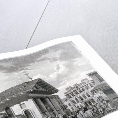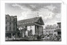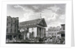 Covent Garden, Westminster, London, c1790. View of Covent Garden Market, the Church of St Paul, Covent Garden and the Grand Hotel with a cart laden with baskets. To the right of the image two women are lifting baskets full of vegetables while a man sits on a basket.