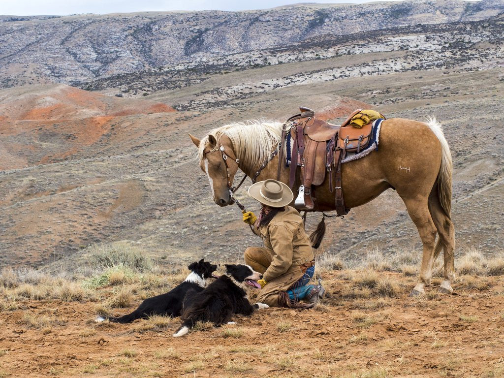 Product details Cowgirl and Her Horse with dog viewing the countryside