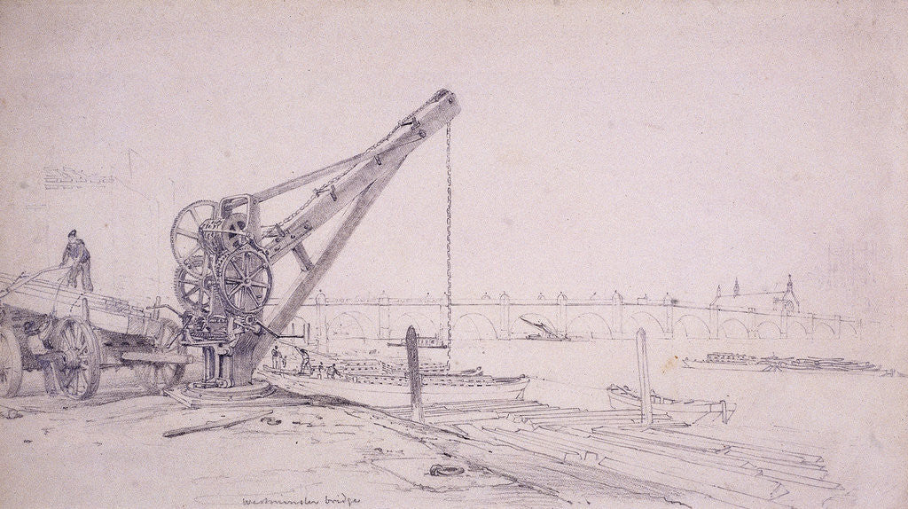Crane at Westminster Bridge, London, c1830. A large crane on the bank of the River Thames, with its mechanism visible. Men unload goods from a cart to the left, with Westminster Bridge, seen from the north east, in the distance.