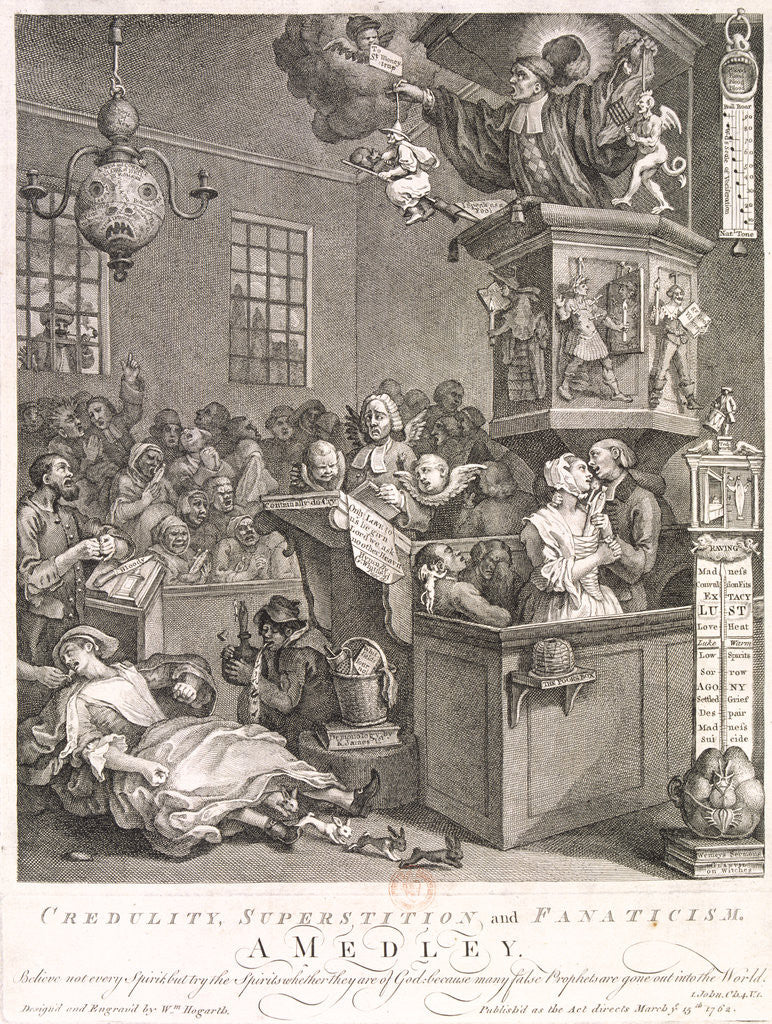 'Credulity, Superstition and Fanaticism. A medley', 1762; Methodist meeting at Whitefield's Tabernacle on Tottenham Court Road, London. In the pulpit a man is preaching, holding images of a witch and a demon whilst the congregation listen to him below. In the foreground, Mary Tofts gives birth to rabbits in an illustration of the famous hoax she pulled off in 1726; many believed that it was actually true. Second and final state of plate.
