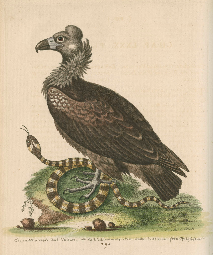 Zoological study of a Cinerous vulture Aegypius monachus with a specimen of Asian snake. Plate 290 from chapter 80 of Gleanings of natural history, exhibiting figures of quadrupeds, birds, insects, plants, &c..., by George Edwards, volume 2 (London, for the author, 1760). The plate is inscribed: 'The crested or coped black Vulture, and the Black and white Indian Snake boath drawn from lie, by G. Edwards,' A second, mirrored inscription provides the date 'October 7 AD 1757.'