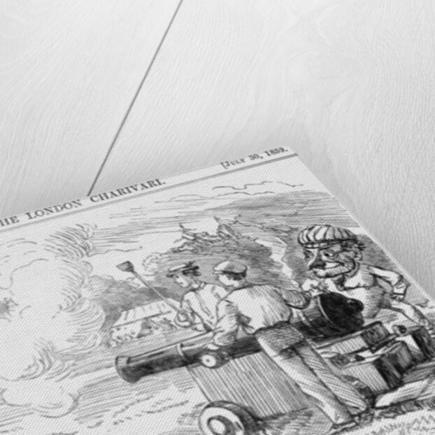 'Cricket - Capital Practice for the Round Bowling of the Period', 1859. This cartoon shows cricket practice being enlivened by the use of a cannon to replace the more traditional bowler. Due to the situation in Europe, and the perceived threat of invasion by Napoleon III, war was much in the news. From Punch, or the London Charivari, July 30, 1859.
