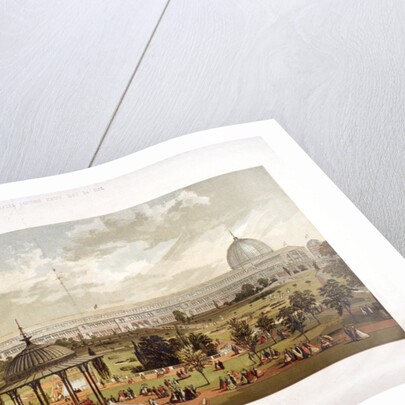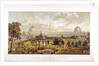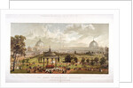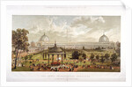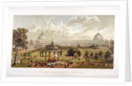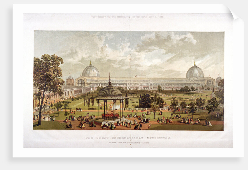 Cromwell Road, Kensington, 1862; view of the building which housed the International Exibition of 1862, as seen from the Royal Horticultural Society Gardens; shows figures in the gardens and a band playing in the bandstand.