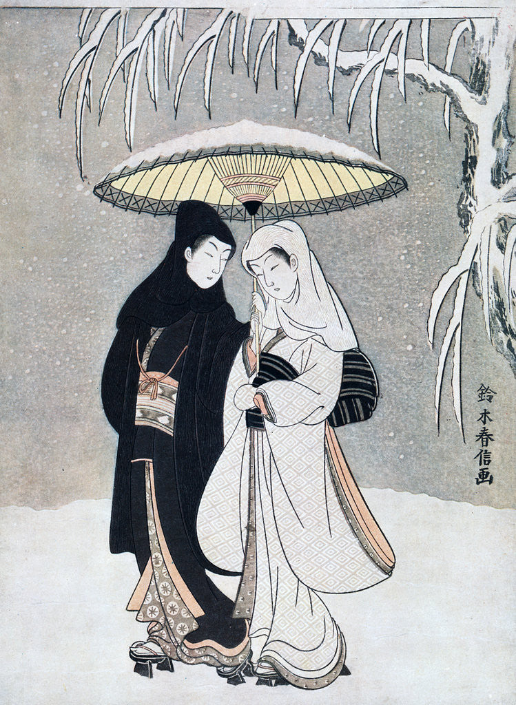 Crow and Heron, or Young Lovers Walking Together under an Umbrella in a Snowstorm