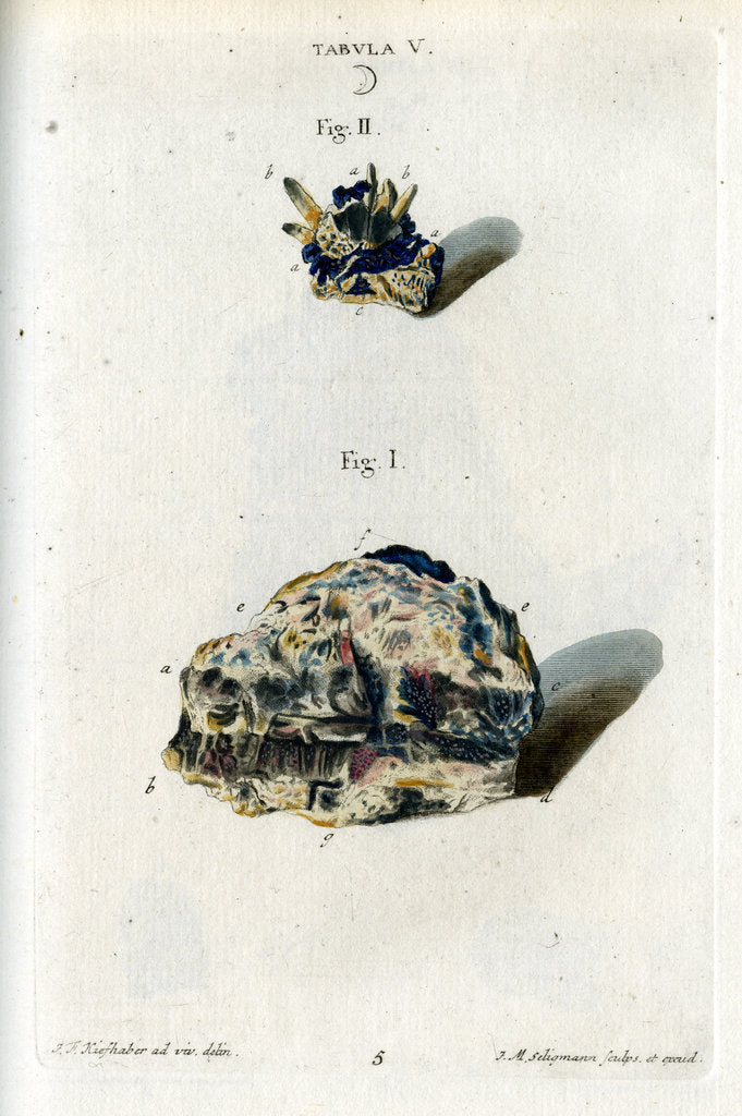 Illustration of crude silver of a purplish brown. This sample was excavated in Freiberg, Saxony. Plate 5 from Fossilium Metalla Et Res Metallicas Concernentium Glebae Suis Coloribus Expressae by Casimir Christoph Schmiedel (Nuremberg, Iohannis Michaelis Seligmanni, 1752). Inscribed, 'Tabula V. J. F. Kiefhaber ad viv. delin. J. M. Seligmann sculps et excud