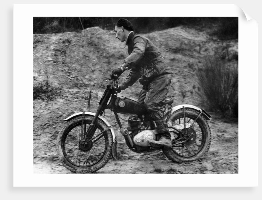 Product details Cullen riding a Francis Barnett bike at the J White Trial