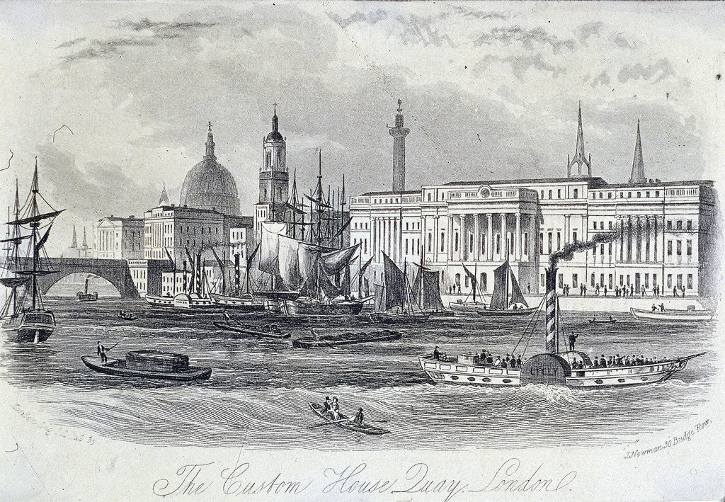 View of the Custom House and quay from the River Thames, London, c1840. Showing various boats on river.