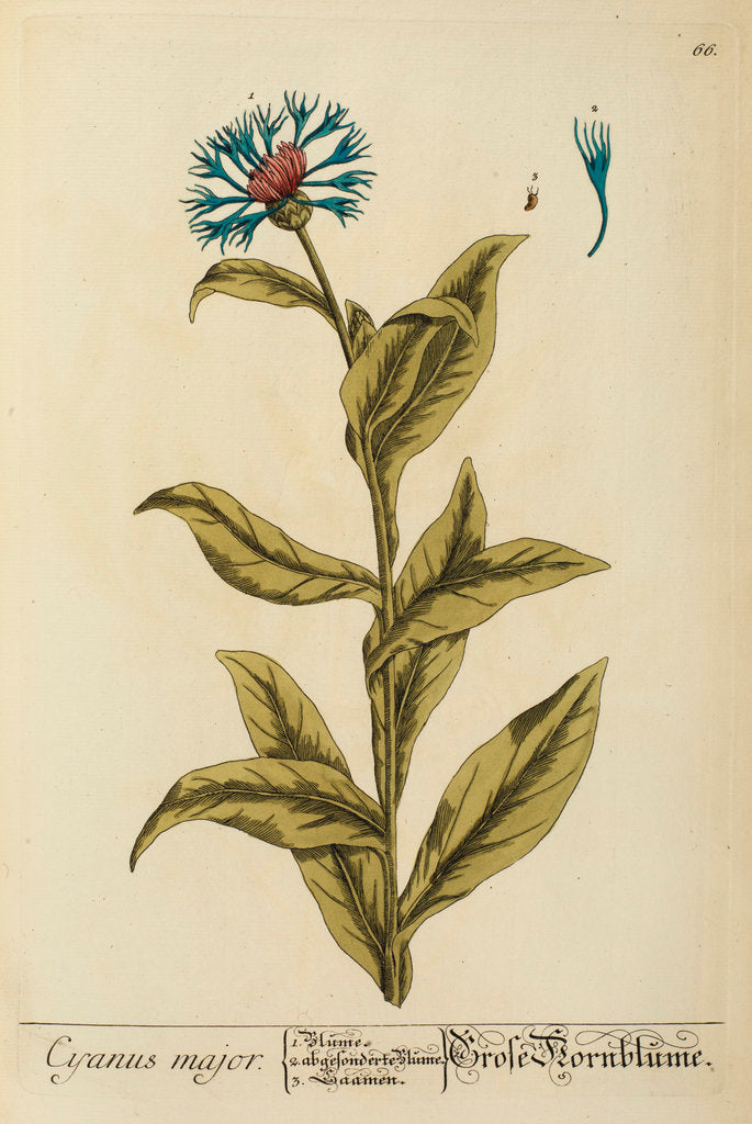 Botanical study of the 'Cyanus major' (Centaurea cyanus, or cornflower). Plate 66 from Herbarium Blackwellianum, vol.1 [Centuria I], by Elizabeth Blackwell (Nuremberg, 1750).