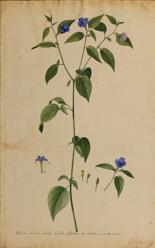 Botanical study of Dalea annua erecta hirsuta, floribus ex caruleo-purpureo variis, showing the stalk, flowers, leaves and seeds of the plant. Includes enlarged images of the flowers and seeds. Original: ink and watercolour on paper. c.1735.