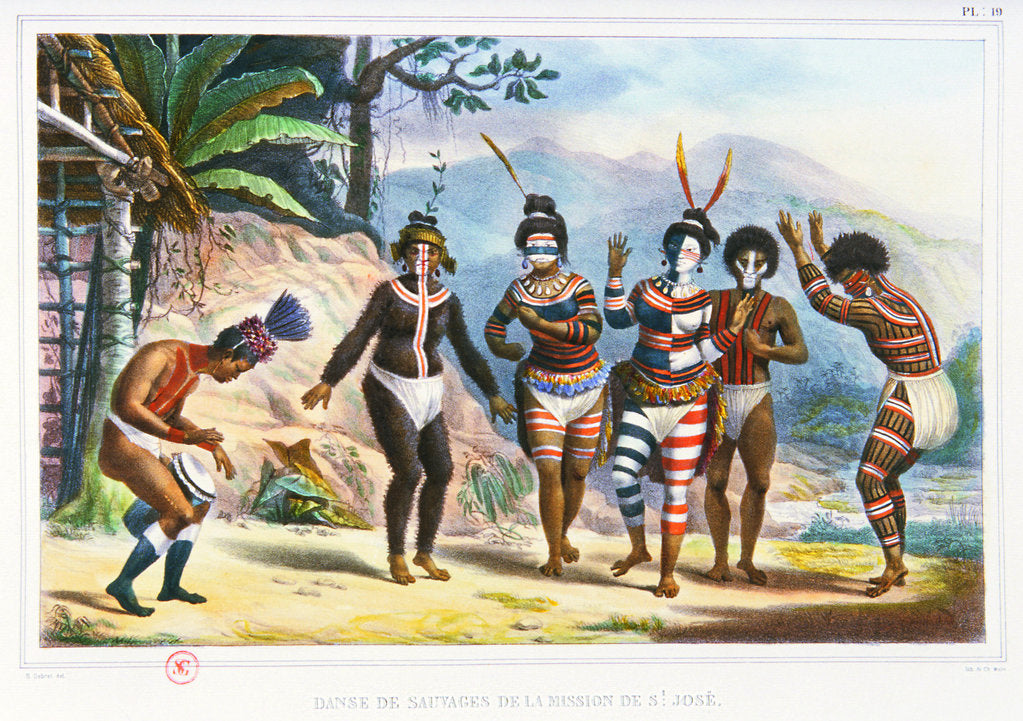 Dance at the mission of Sao Jose. Illustration from Voyage pittoresque et historique au Brésil, 1834. Found in the Collection of Bibliothèque Sainte-Geneviève, Paris.