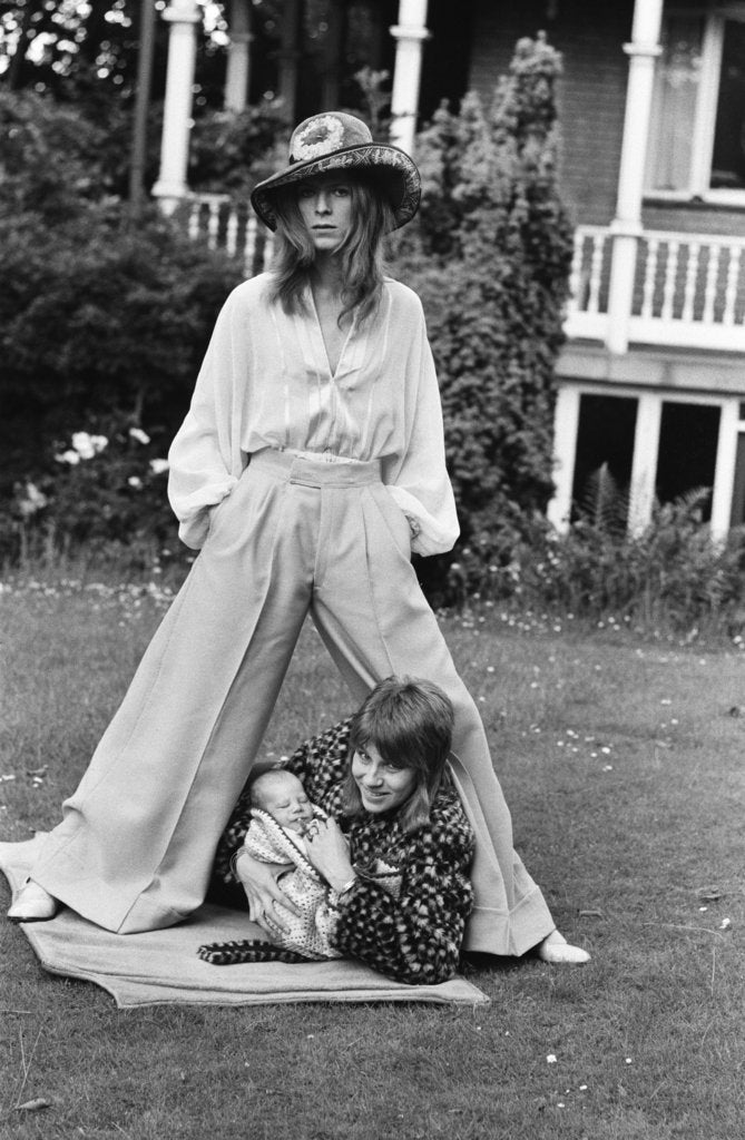 David Bowie, the pop star and song writer, whose wife Angie three weeks ago presented him with a baby boy, which they have called Zowie. Here he is pictured with his family, wearing 44 inch Oxford Bags in pink seaside gaberdine. His shirt is Turkish cotton with a soft felt floppy hat. 29th June 1971.