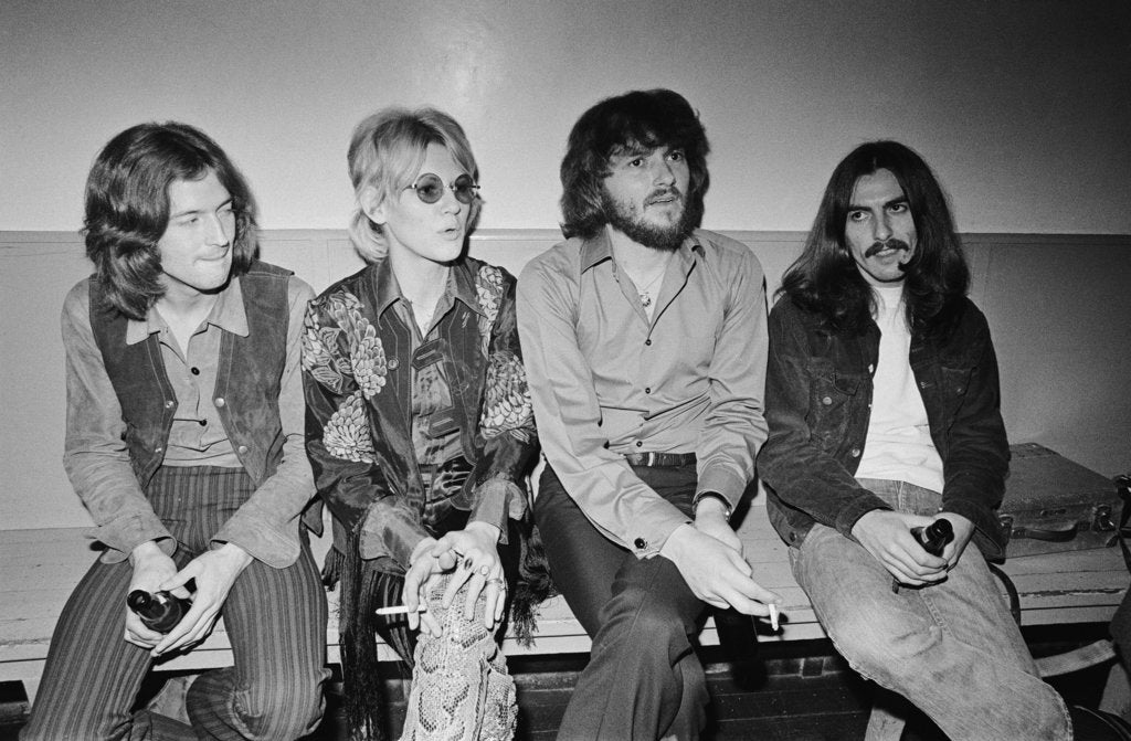Delaney & Bonnie & Friends music concert at Birmingham Town Hall 4th December 1969. Pictured backstage: Eric Clapton Bonnie Bramlett Delaney Bramlett George Harrison
