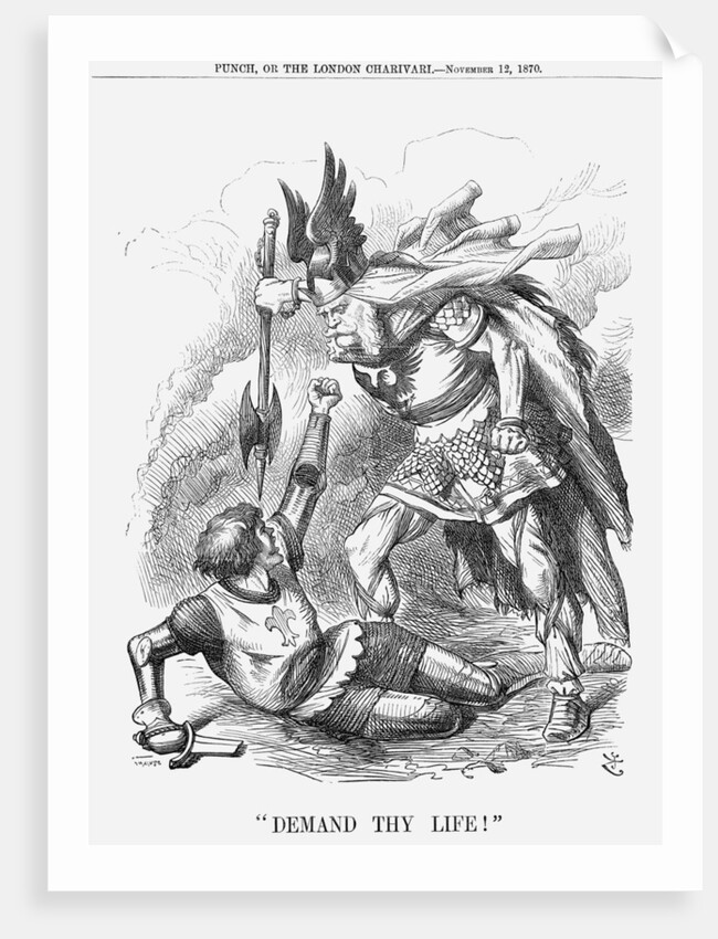Demand Thy Life, 1870. France is defiant under the attack of Wilhelm I of Prussia. France was on the verge of complete defeat in the war she had declared against Prussia. This cartoon accompanies a long poem in which Punch itemises how France has been betrayed by her Emperor, her Ministers, her publicists, her orators, her journalists and her army. From Punch, or the London Charivari, November 12, 1870.