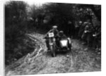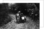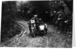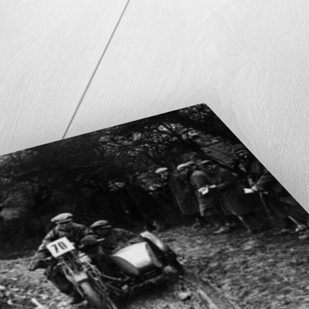 Dennis Mansell competing in the Victory Cup Trial, 1927. Riding with a passenger in a sidecar along a muddy track.