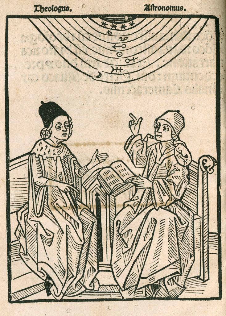 A depiction of a dialogue between a theologian (left) and an astronomer (right), frontispiece to Cocordatia astronomie cu theologia, by Petrus de Aliacus (1490).