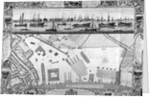 Deptford Docks, London, 1753. Plan of the Dock Yard at Deptford including the surrounding area. In the upper section is a view of the River Thames with water vessels. The border contains decorative features, vignettes and coats of arms.