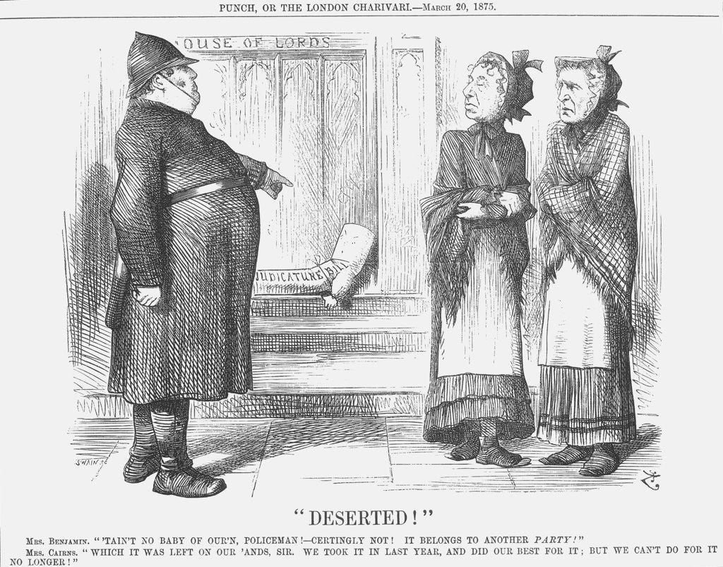 Deserted !, 1875. Mr Disraeli, the Conservative Prime Minister, stands on the right with his Lord Chancellor, Hugh McCalmont Cairns, 1st Earl Cairns. The burly policeman points to the Baby Judicature Bill lying on the doorstep of the House of Lords. Disraeli and Cairns refuse to have anything to do with the Baby Bill, claiming it was left from the previous Liberal administration. From Punch, or the London Charivari,