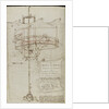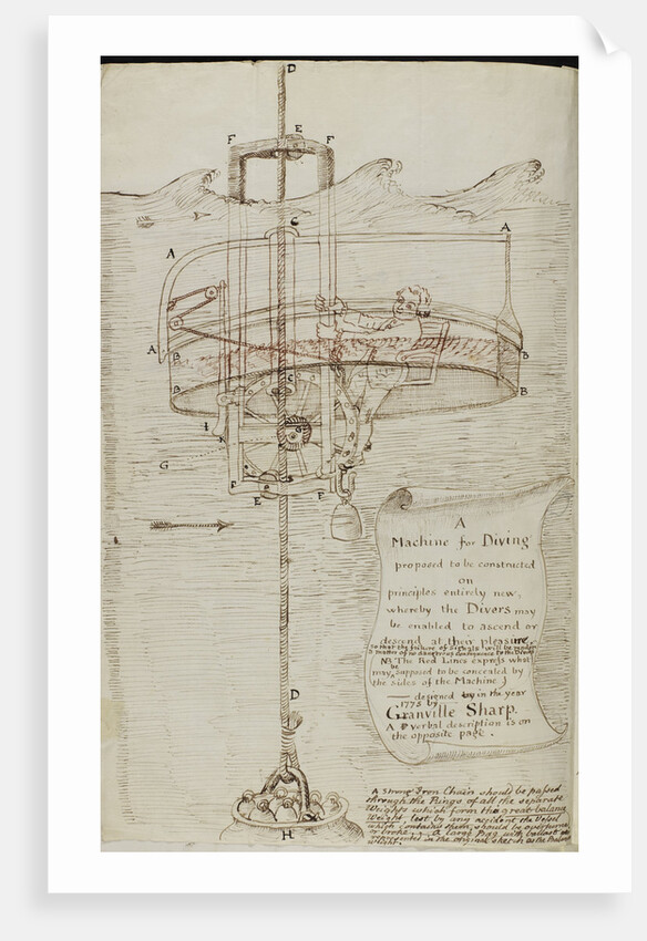 Unpublished plate from a paper on the art of diving by Anthony Fothergill FRS (1737-1813) and Granville Sharp. Submitted to Dr William Watson for publication in the Philosophical Transactions of the Royal Society, but not printed. The scheme shows an upturned boat with a single passenger. The boat is held in a wooden frame and a weighted rope is passed through its keel. By operating a pulley system, the diver supposedly can raise and lower the improvised diving bell. Inscribed: 'A Machine for Diving proposed to be constructed on principles entirely new, whereby the Divers may be enabled to ascend or descend at their pleasure...designed in the year 1775 by Granvill Sharp...' An endorsement verso states that this is a 'Copy of an original Sketch (designed in 1775..).'