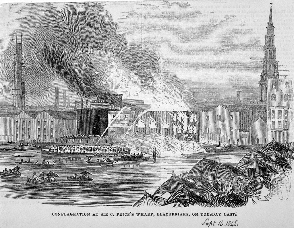 Destruction of Sir C Price's oil warehouse and wharf, William Street, Blackfriars, London, 1845. In the foreground figures stand sheltering under umbrellas watching the event. From thee Illustrated London News.