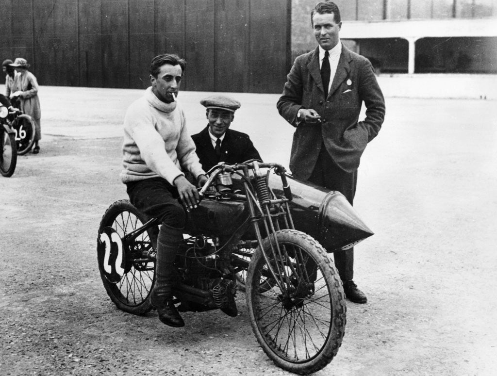 DH Davidson on a Flat Twin Harley-Davidson, Brooklands, Surrey, 1920. Sitting on the bike smoking a cigarette, with a passenger in the sidecar.