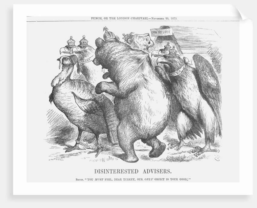 'Disinterested Advisers', 1875. Turkey is surrounded by 'Disinterested Advisers' in the shape of the Russian Bear and the Eagles representing Austria and Germany. The British Lion remains aloof in the background. This matter goes back some way to 1873 when the three powers of Russia, Germany and Austria formed a loose alliance. At the same time, Turkish administration was failing and the Ottoman Empire was heading towards bankruptcy. The three powers were keen to avoid this crisis and eventually agreed upon a course of diplomatic action to pacify insurgent districts such as Bosnia whose people had recently revolted against Turkey. From Punch, or the London Charivari, November 20, 1875.
