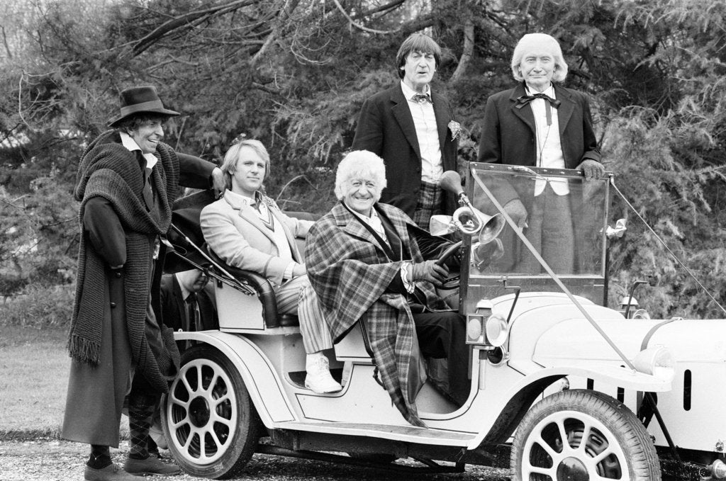 Photocall for special 90 minute Doctor Who episode titled 'The Five Doctors', which will celebrate 20 years of the sci fi series, 17th March 1983. Peter Davidson - the current doctor will be joined by his predecessors Patrick Troughton the 2nd doctor - Jon Pertwee the 3rd doctor & Tom Baker the 4th doctor will be seen in vintage footage, with the role of the first doctor being played by Richard Hurndall (standing in for the late William Hartnell. Actor Tom Baker did not attend the photocall & was substituted by his waxwork from Madame Tussauds.