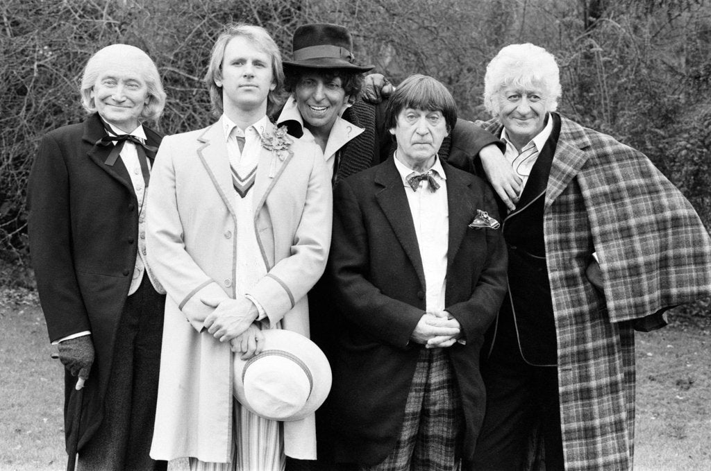 Photocall for special 90 minute Doctor Who episode titled 'The Five Doctors', which will celebrate 20 years of the sci fi series, 17th March 1983. Peter Davidson - the current doctor will be joined by his predecessors Patrick Troughton the 2nd doctor - Jon Pertwee the 3rd doctor & Tom Baker the 4th doctor will be seen in vintage footage, with the role of the first doctor being played by Richard Hurndall (standing in for the late William Hartnell. Actor Tom Baker did not attend the photocall & was substituted by his waxwork from Madame Tussauds.