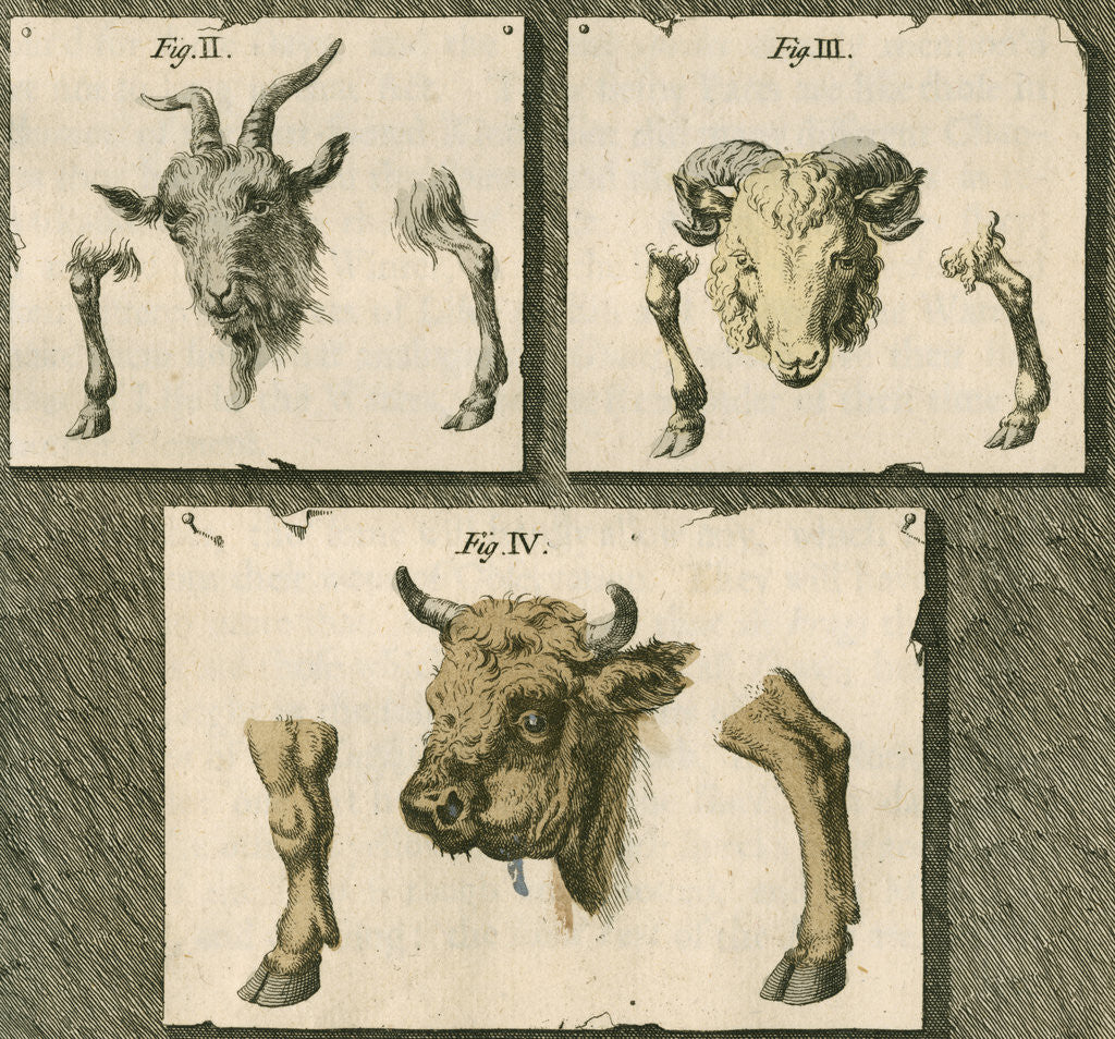 Zoological studies of a goat, sheep and cow, showing their horned heads and examples of the fore and hind limbs of each. Figures 2, 3 and 5 from plate 17 from the book A philosophical account of the works of nature, by Richard Bradley (London, 1721). The figures are represented as being on three pieces of paper pinned to the darkened background of the plate. Inscribed "Plate XVII. T.Cole sculp." Richard Bradley (1688-1732) English botanist and writer, was elected a Fellow of the Royal Society in 1712.