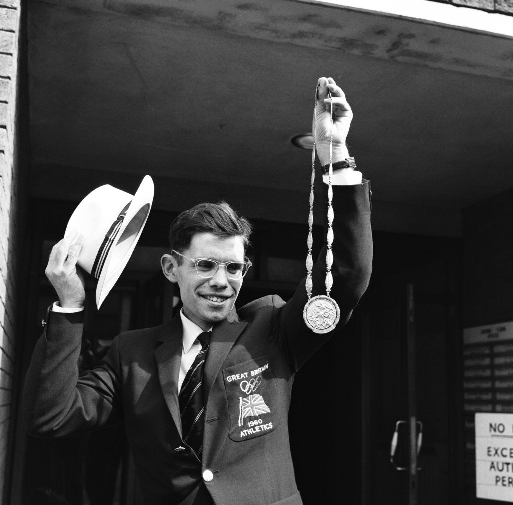 Don Thompson, British athlete, pictured on his return from the Olympic Games, 12th September 1960. He was the only British man to win a gold medal at the 1960 Summer Olympics, held in Rome, in the men's 50 km walk.