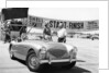 Donald Healey with an Austin Healey at a motor race. Photographed with a young woman next to the car at the start/finish line of a motor race.