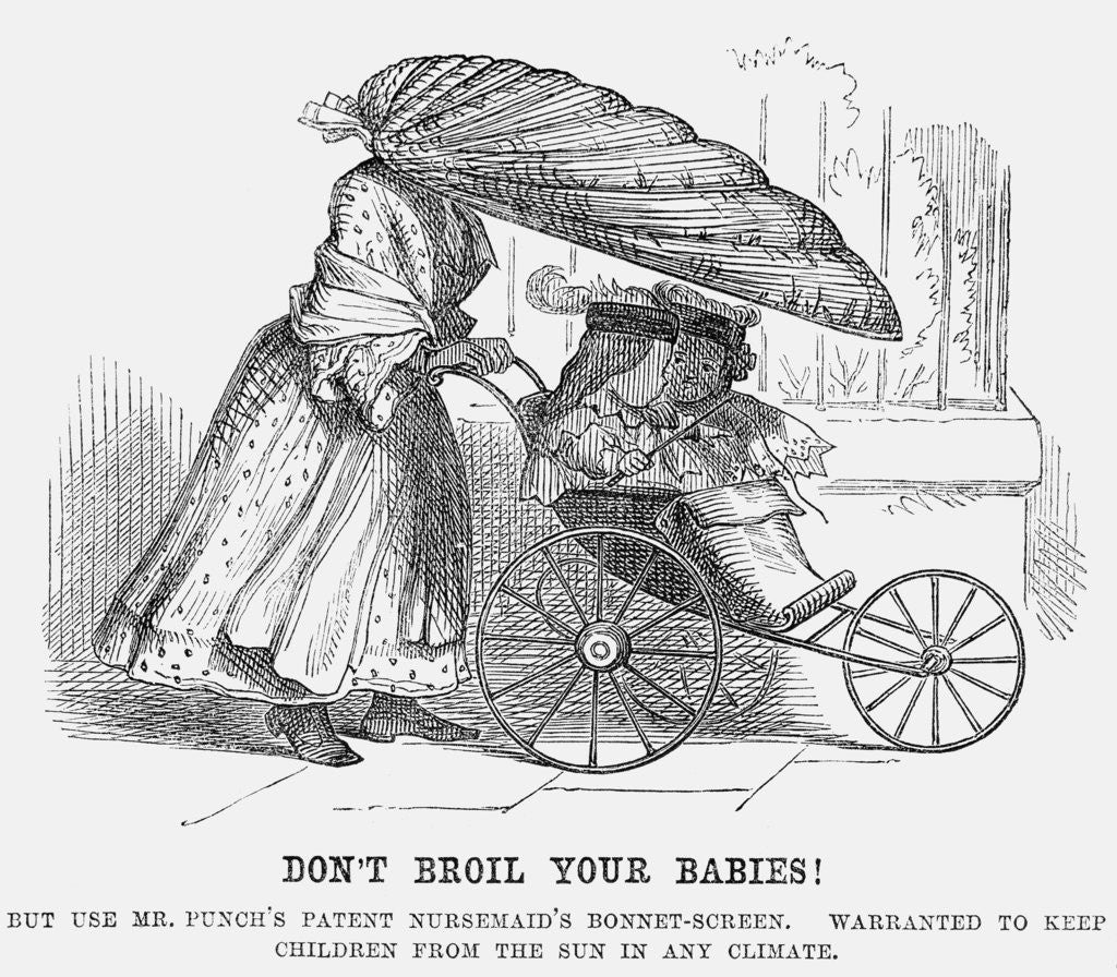 'Don't Broil your Babies!', 1859. The nursemaid's bonnet is large enough to act as a sunshade for the two children. The pram could be seen as a prototype of the latest fashion in pushchairs in 2001. Another of Mr Punch's regular digs at the world of women's fashion. From Punch, or the London Charivari, 1859.