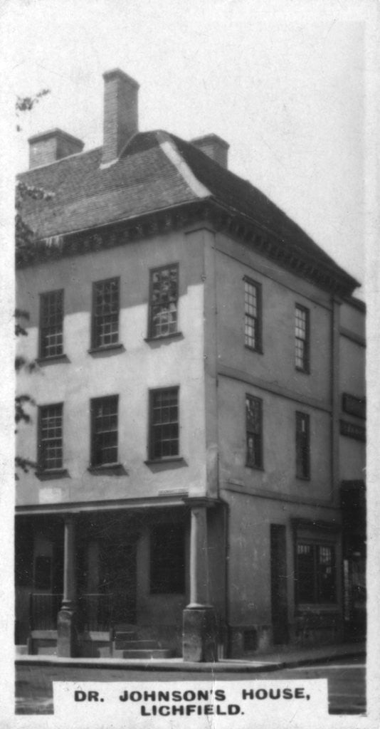 Dr Johnson's house, Lichfield, Staffordshire, c1920s. A critic, lexicographer, essayist, biographer and poet Samuel Johnson (1709-1784) was one of the oustanding personalities of 18th century Britain. In 1755 he published his Dictionary of the English Language, regarded as the first great English dictionary, which took him 8 years to compile. Noted as a wit and conversationalist, Johnson founded the Literary Club in c1763, which numbered David Garrick, Edmund Burke, Oliver Goldsmith and Joshua Reynolds amongst its distinguished membership. Much of his fame derives from his highly popular biography, Life of Johnson, written by his friend and contemporary, James Boswell. Cigarette card produced by the Westminster Tobacco Co Ltd, The second series of British royal and ancient buildings.