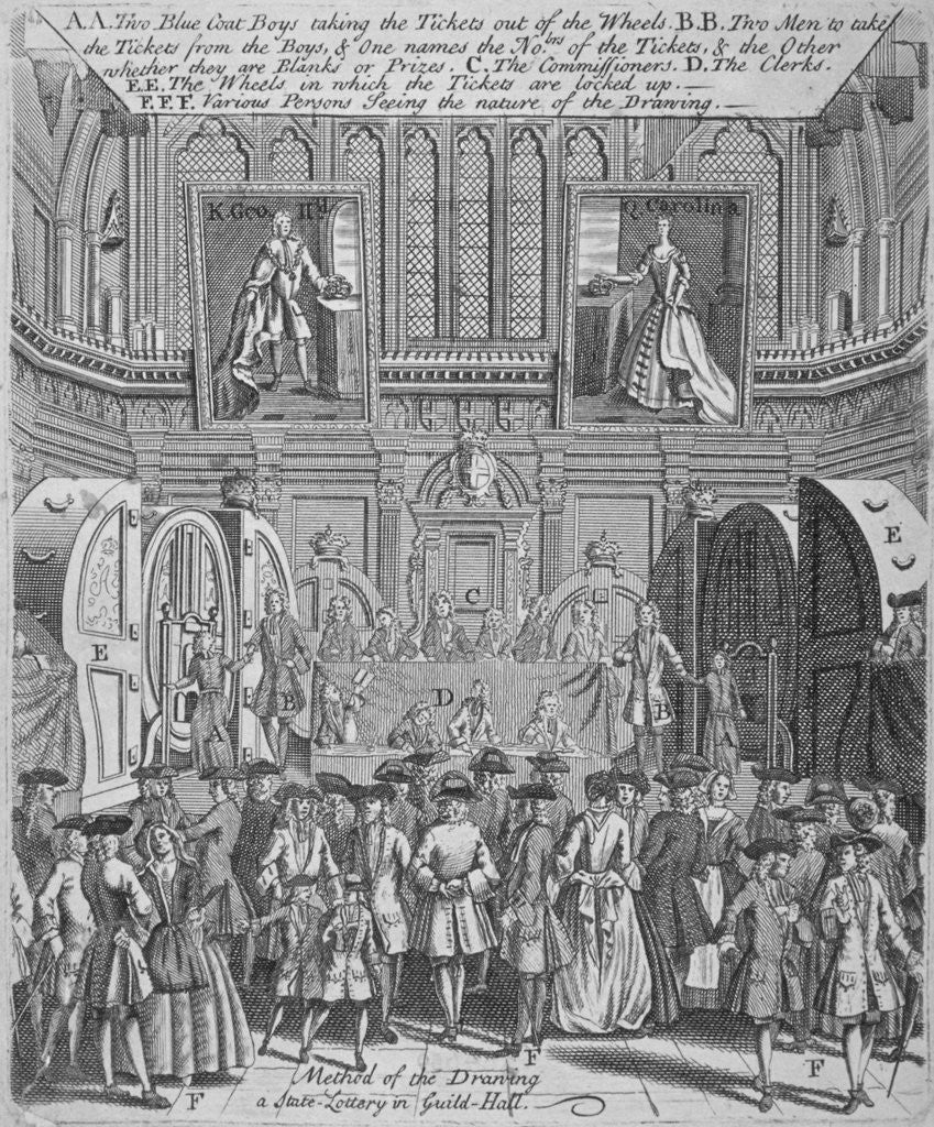Drawing of the state lottery in the Guildhall, City of London, 1739. Including a key to the figures.