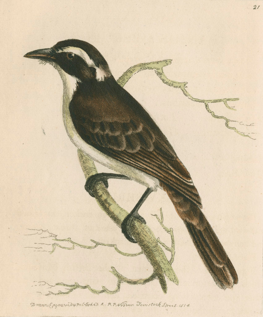Ornithological study of a bird described by the author as Lanius obscurus, the dusky shrike. Side view, posed on a tree branch. Plate 21 from The zoological miscellany; being a description of new, or interesting animals, by William Elford Leach, volume 1 (London, 1815). The plate is inscribed: 'Drawn Engraved & Published by R. P. Nodder Tavistock Street. 1814.' William Elford Leach (1790-1836) British naturalist was elected a Fellow of the Royal Society in 1816.