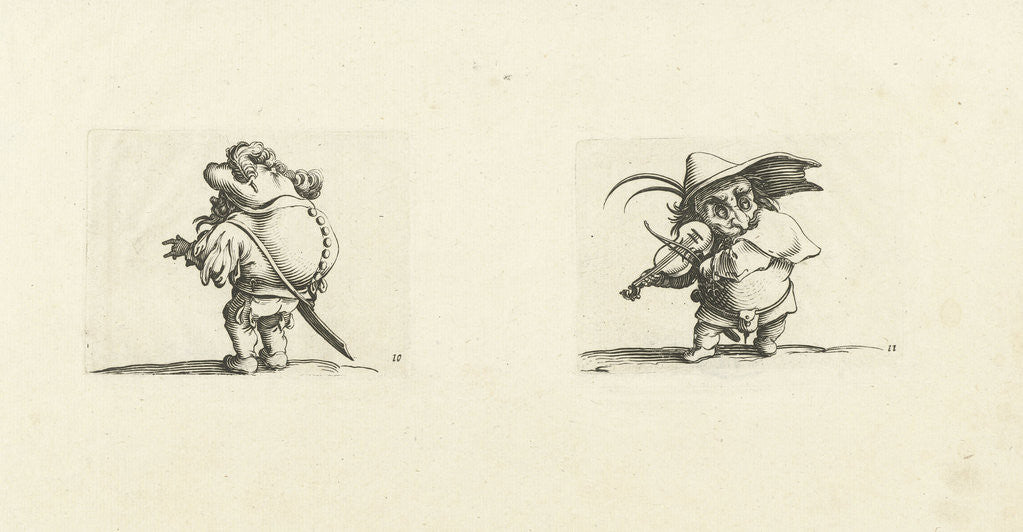 Dwarf with sword, a row of buttons on the back; Dwarf with violin and sword, Jacques Callot, Abraham Bosse, 1621 - 1676