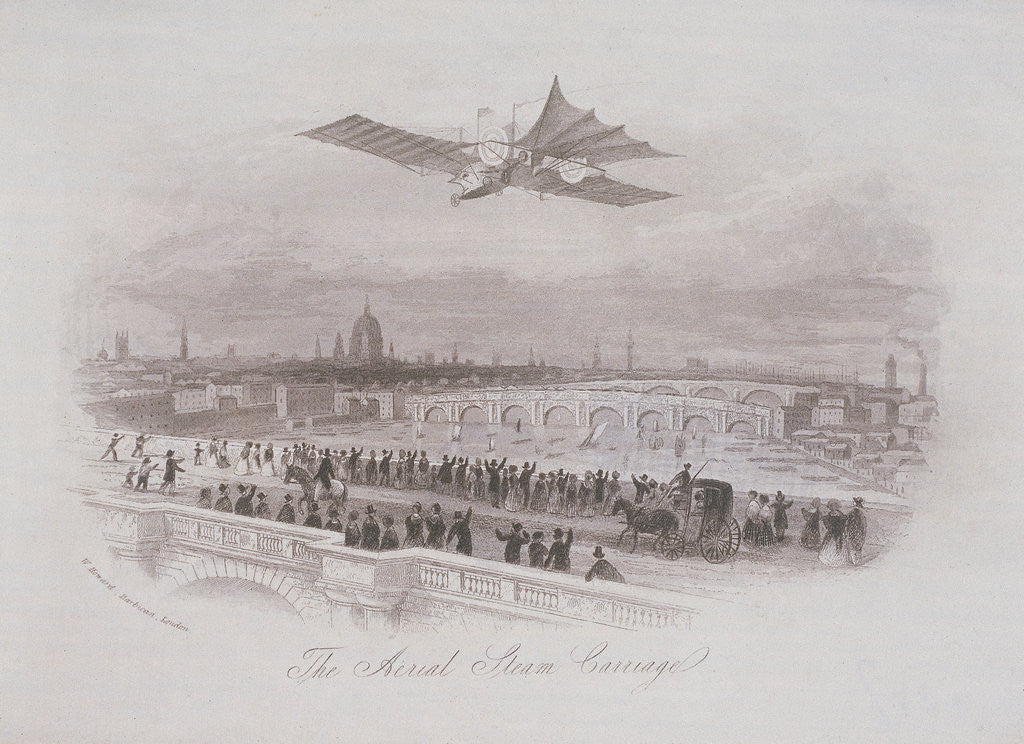 View of an early flying machine passing over London, c1843; figures watch its progress from Westminster Bridge and Waterloo Bridge.