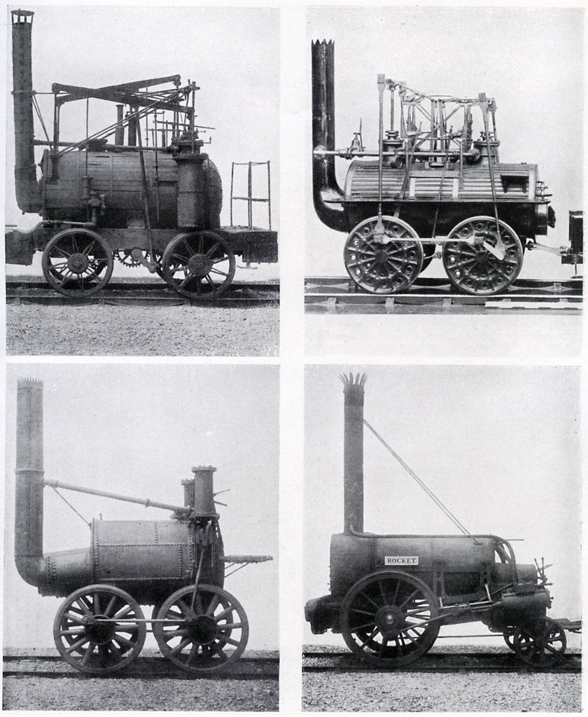 Early locomotives, 19th century, (c1920). From the top left: Puffing Billy, 1813; The Locomotion, 1823;, The Rocket, 1829; and the Sans Pareil, 1829. From Story of the British Nation, Volume III by Walter Hutchinson. (London, c1920s)