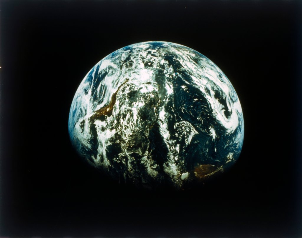 Earth from Apollo 15, 26 July 1971. Planet Earth photographed by the Apollo 15 crew, from between 25,000 and 30,000 nautical miles away. The United States, Central America and part of Canada can be seen at the left, with South America at lower centre. Spain and the northwest part of Africa can be seen at right. Also visible is a large North Atlantic storm front moving over Greenland (upper centre).