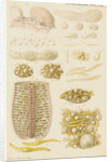 Plate 19 from the paper 'On the double organs of generation of the lamprey, the conger eel, the common eel, the barnacle, and the earthworm, which impregnate themselves; though the last from copulating, appear mutually to impregnate one another', by Everard Home, Philosophical Transactions of the Royal Society, vol.113 (1823), pp.140-151. Details of the sexual organs, eggs and embryos of the earthworm. Figures 1-4 show the testicle, ovaries and egg sacks containing eggs and embyros at different stages. Figures 5-9 show immature worms with a dissected view of the tail portion of an adult worm. Signed in ink lower left 'Franz Bauer del.' Royal Society stamp verso.