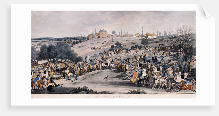 'Easter Monday', 1820; showing a crowd of figures with horses and carriages at Buckhurst Hill in Epping Forest, Essex, watching a small deer being turned out of a cart, with a group of riders and hounds behind them.