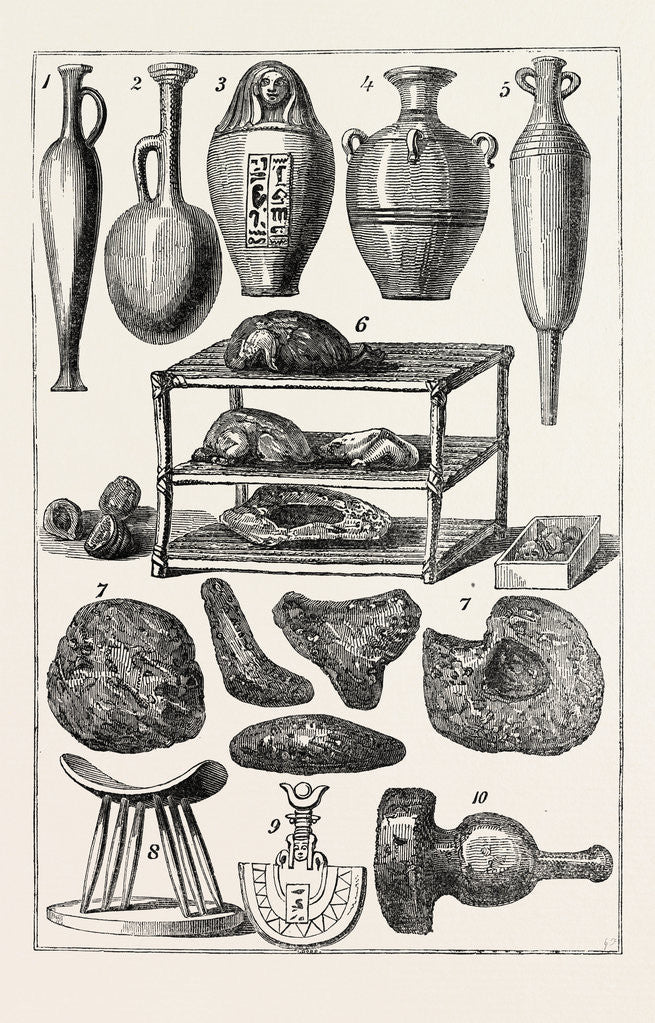 EGYPTIAN ANTIQUITIES: 1, 2, 3, 4,5. Bottles and Vases. 6. Prepared Funereal Feast, 7. Cakes. 8. Support for the Head., 9. Head of a Boat. 10: Mason's Mallet