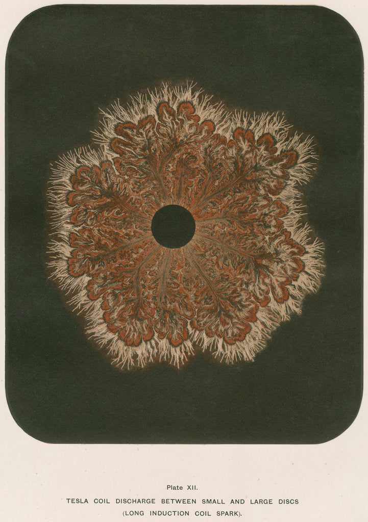 Study of patterns produced by electrical discharges on surfaces revealed by dusting with powdered red lead and sulphur. Sometimes termed 'Lichtenberg figures'. These experiments were conducted at Cragside in Northumberland, England, using a Wimshurst machine (electrostatic generator) and two 10-gallon Leiden jars. Current was conveyed to two rod conductors with a spark gap at which coated wires discs or plates were positioned. Lord Armstrong exhibited figures of the type produced at the Royal Society soiree at Burlington House in London on 16 June 1897. Plate 12 from Supplement to Lord Armstong's work on electric movement in air and water...by William George Armstrong and Henry Stroud (London, Smith Elder & Co., 1899). The plate is inscribed below: 'Plate XII. TESLA COIL DISCHARGE BETWEEN SMALL AND LARGE DISCS (LONG INDUCTION COIL SPARK).' William George Armstrong, Baron Armstrong (1810-1900) armaments manufacturer and industrialist was elected a Fellow of the Royal Society in 1846.